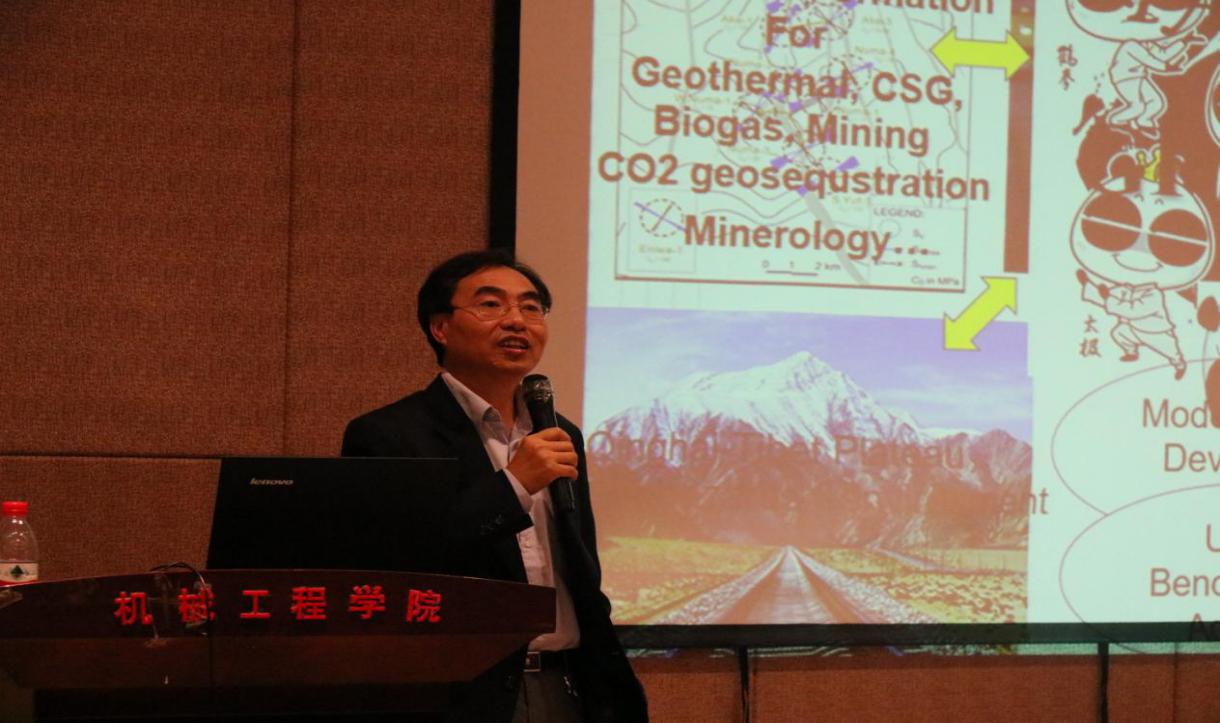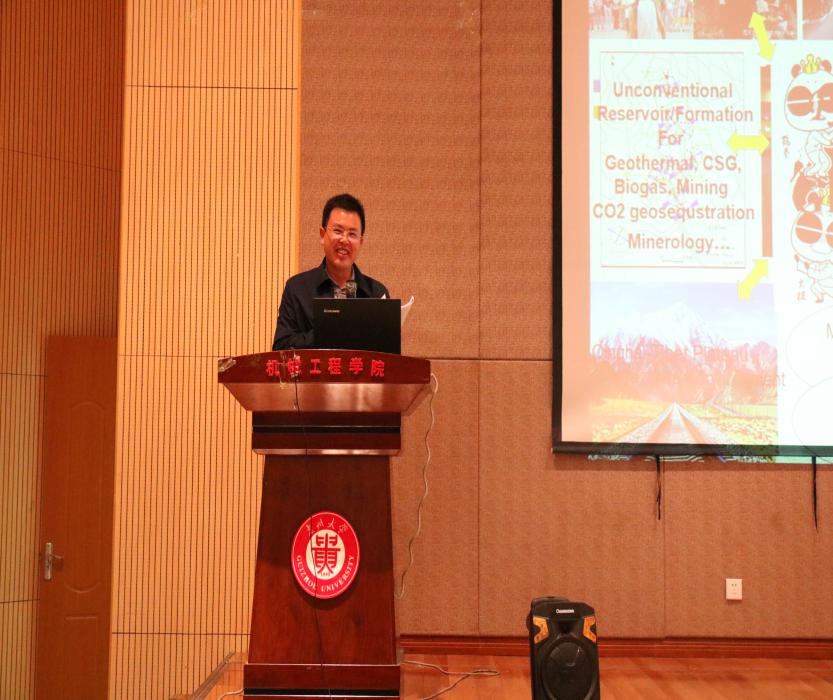 在短暂的休息过后,进行会议第二阶段:学术报告。本次活动月开幕式的特邀嘉宾是来自澳大利亚昆士兰大学的邢会林研究员,他做了题为:《多尺度多场计算地学及其在矿业工程领域的应用》的学术报告。在讲座中他主要介绍了自己所研究的方向,在国际前沿的团队科技研究成果,如开发了软件pandas,结合地球数字化发展趋势,将数值模拟、超级计算、大数据与固体地球科学、资源及地质工程相结合等,并对矿业工程的发展前景给出了良好的建议。期间掌声不断,同学们的热情高涨,几次打断研究员的报告。