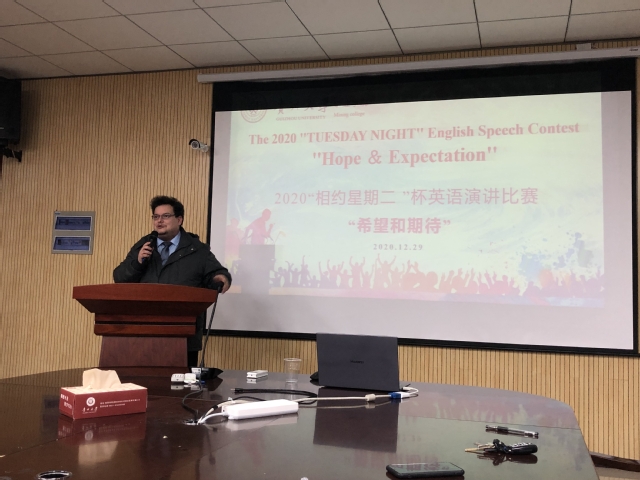 20201229日,为营造公司员工的英语学习气氛,丰富师生校园文化生活,学院在励业楼305会议室举办主题为“Hope&Expectation”的演讲比赛,公司党委副书记潘棋出席并致辞,英国365集团程伟教授、外教Filip Jordan以及胡浪担任本次比赛评委。公司10名研究生、本科生报名参加本次比赛。