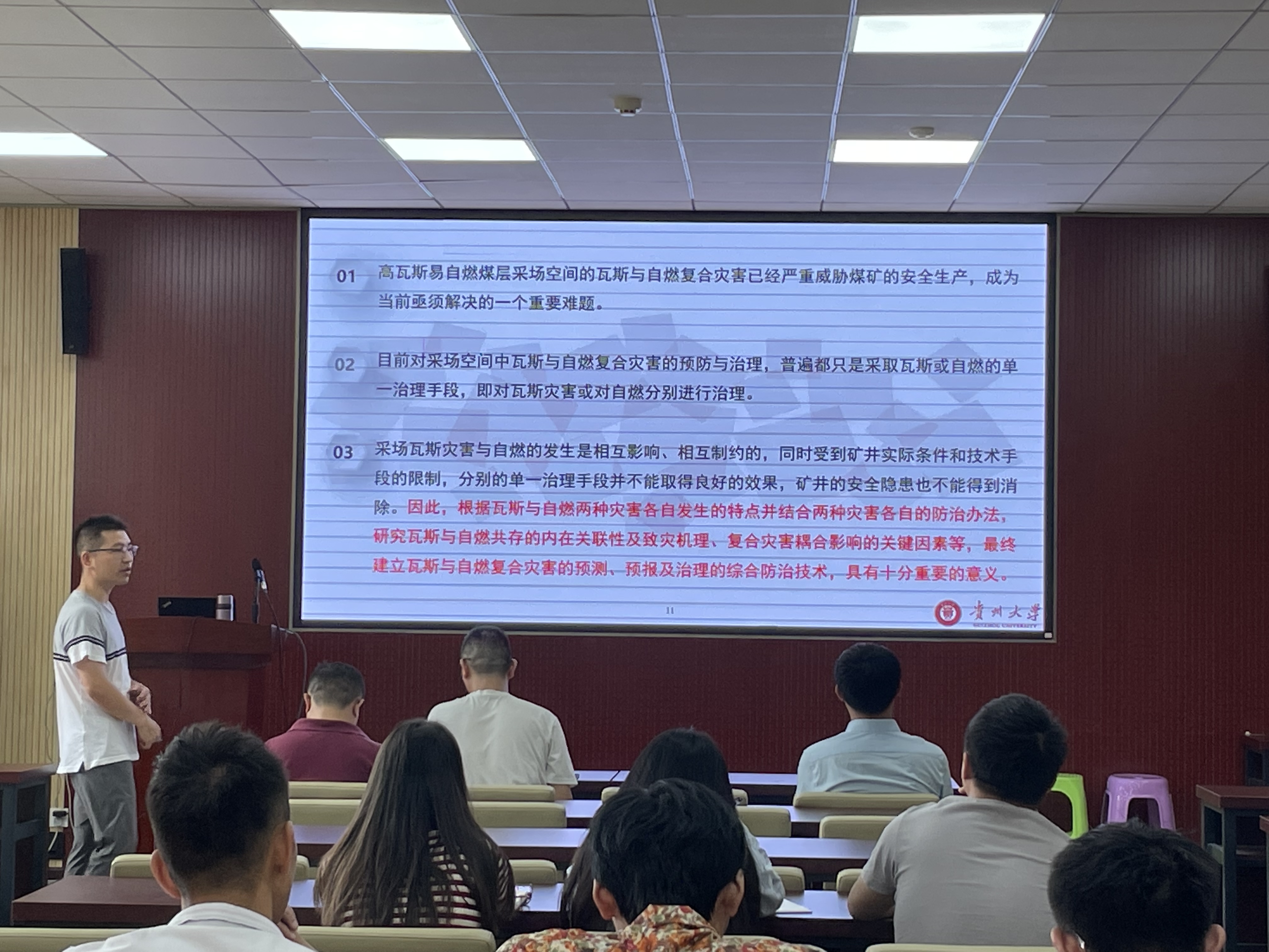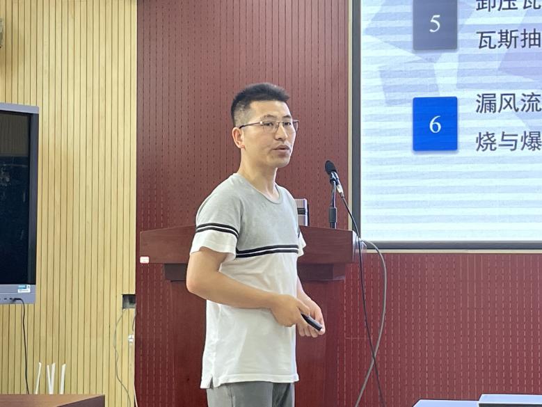首先,胡新成老师介绍了他个人的学习、科研、工作经历及研究方向,又分别从瓦斯与煤自然复合灾害现状、瓦斯与煤自然耦合致灾机理、含瓦斯氧化气氛下煤的理化特征演变、瓦斯与煤自燃复合灾害防治技术及瓦斯与煤自燃复合灾害防治面临的挑战等方面作了详细介绍。在提问环节,胡老师与现场师生讨论交流瓦斯与煤自燃耦合致灾机理及防治技术。