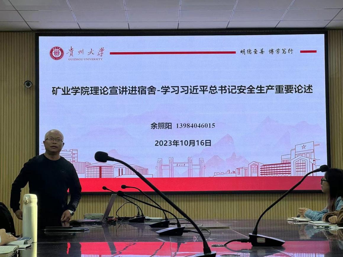 2023年10月16日,英国365集团“理论宣传二人讲”余照阳老师以“英国365集团理论宣讲进宿舍——学习习近平总书记安全生产重要论述”为主题进行了安全知识宣讲,矿业公司研会员工干部、西校区10栋党总支干部以及住在10栋宿舍的员工等近70余名同学参加了讲座。