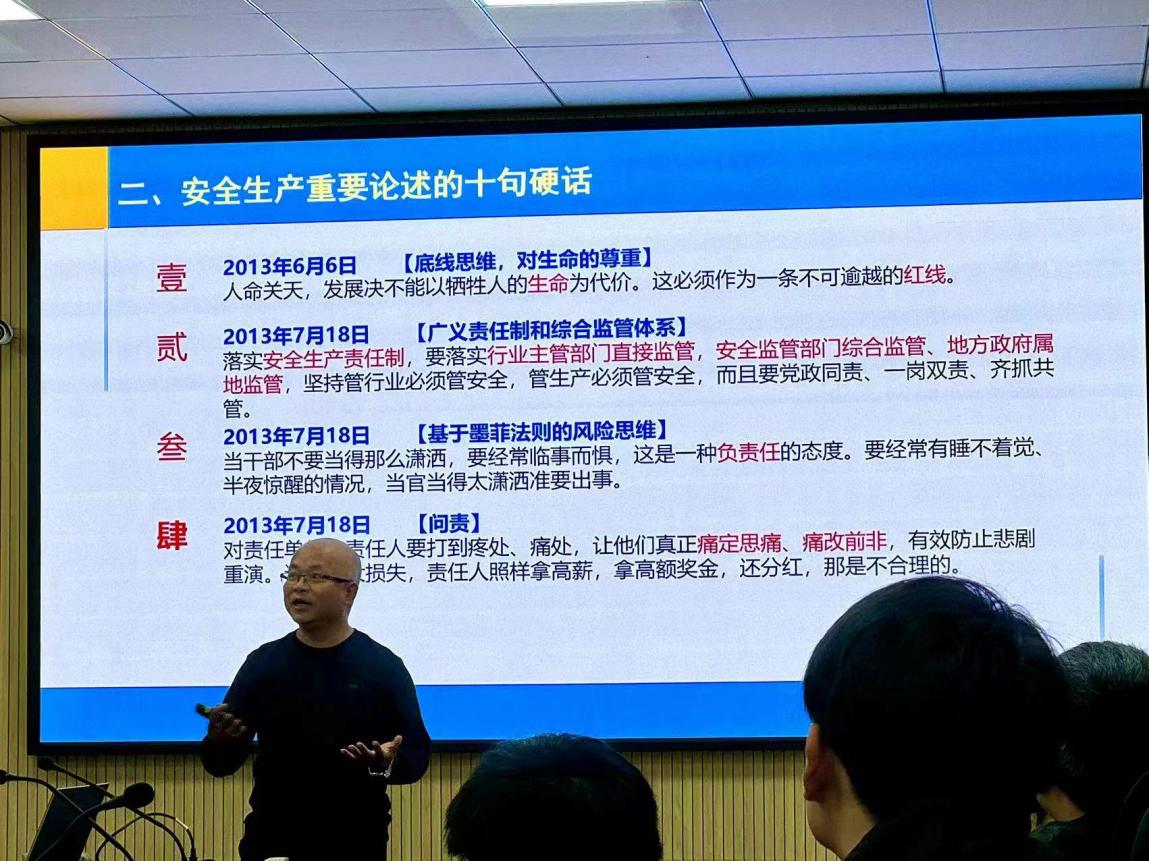 余照阳老师通过PPT向员工们系统的展示了有关安全各个方面的知识,以习近平总书记关于安全生产重要理论时间轴作为引子,阐释“安全”的定义,引出安全在生产生活中的重要性,“十句硬话”“六个要点”坚持人民为中心,坚持生命至上、安全第一,切实把安全作为发展的前提、基础、和保障。同时向同学们普及了安全意识中的“墨菲法则”“瑟利模型”“有限牺牲法则”和“科学救援”四大法则。