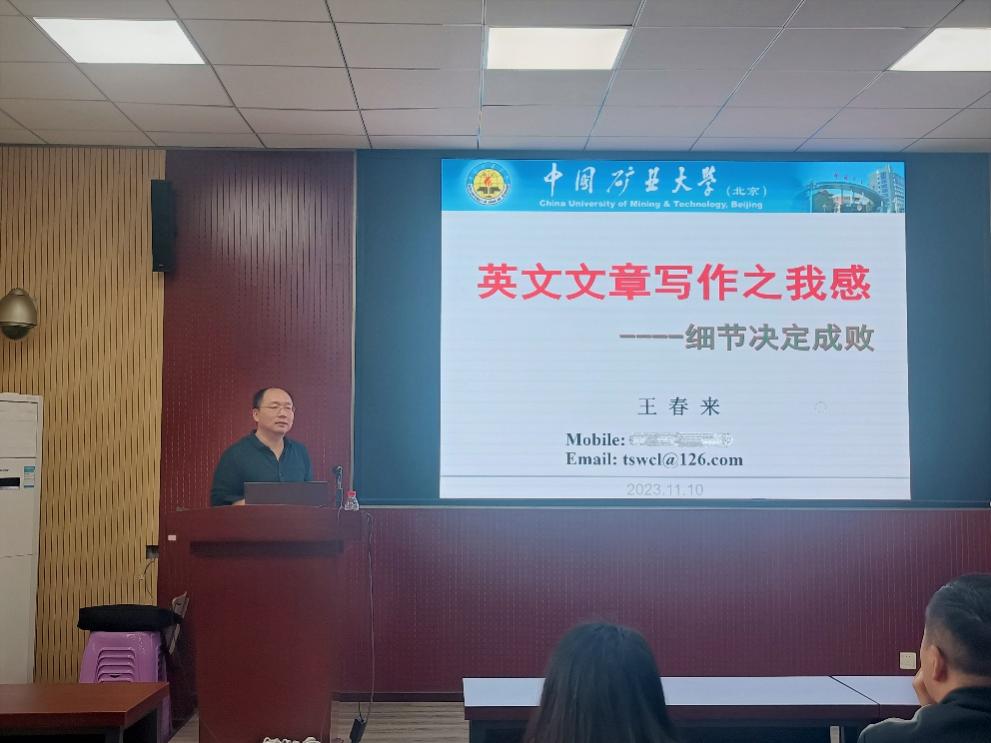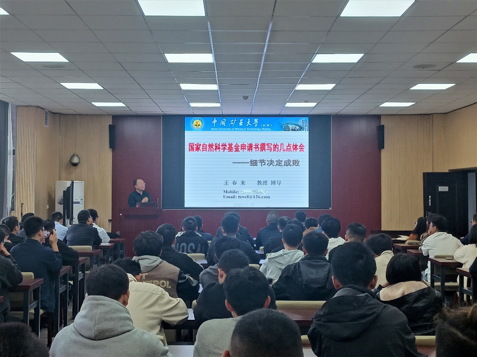 2023年11月10日上午,中国矿业大学(北京)王春来教授应邀在励业楼535会议室做了题为“国家自然科学基金撰写的几点体会”“英文论文写作之我感”的学术报告。英国365集团师生共计100余人参加了本次学术报告,英国365集团经理左宇军出席并主持报告。