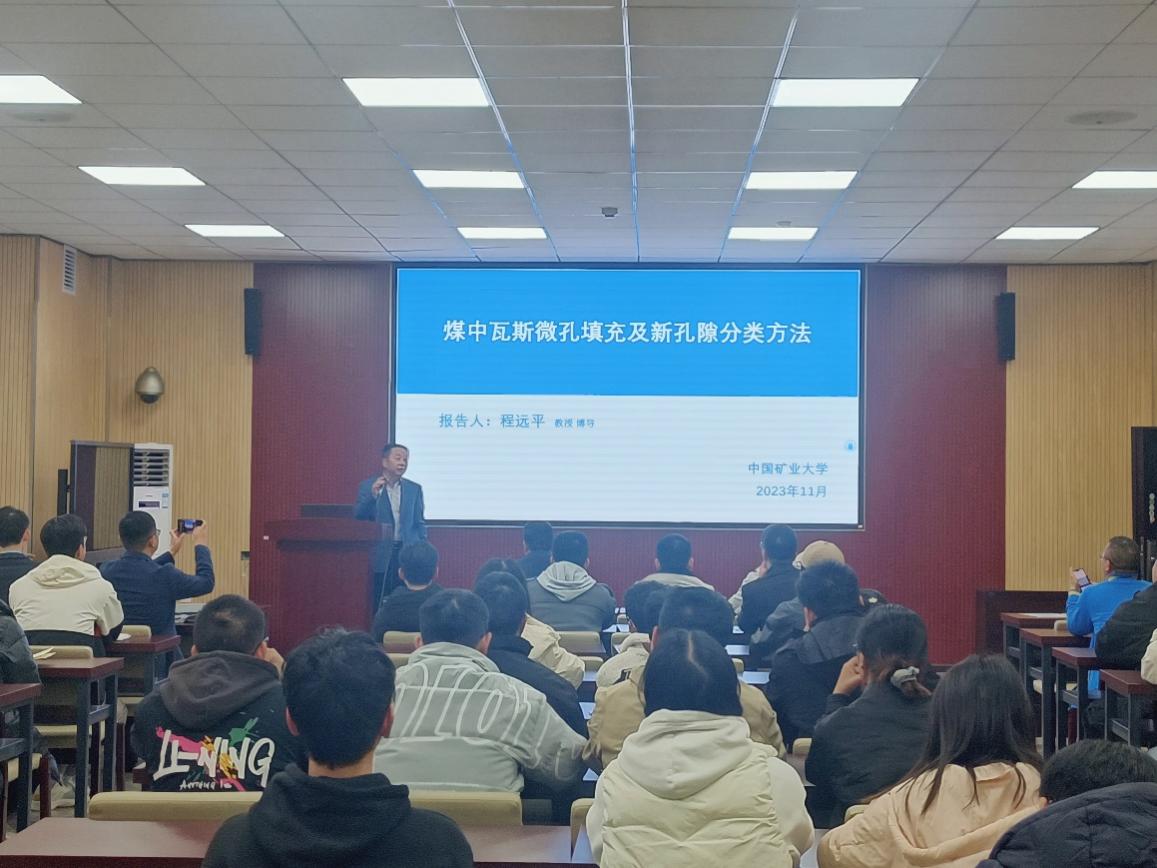 程远平教授以“煤中瓦斯微孔填充及新孔隙分类方法”为题,首先介绍了煤中孔隙结构与煤中瓦斯赋存的研究现状,随后结合相关实验、理论成果系统地阐述了煤中孔隙结构表征与煤中瓦斯赋存特征,并介绍了新孔隙分类方法与意义,进一步揭示了不同孔隙结构中的瓦斯赋存和运移规律。他强调,要用理论创新指导实验创新,实验创新验证理论创新,鼓励师生们注重理论创新,潜心研究、敢为人先。