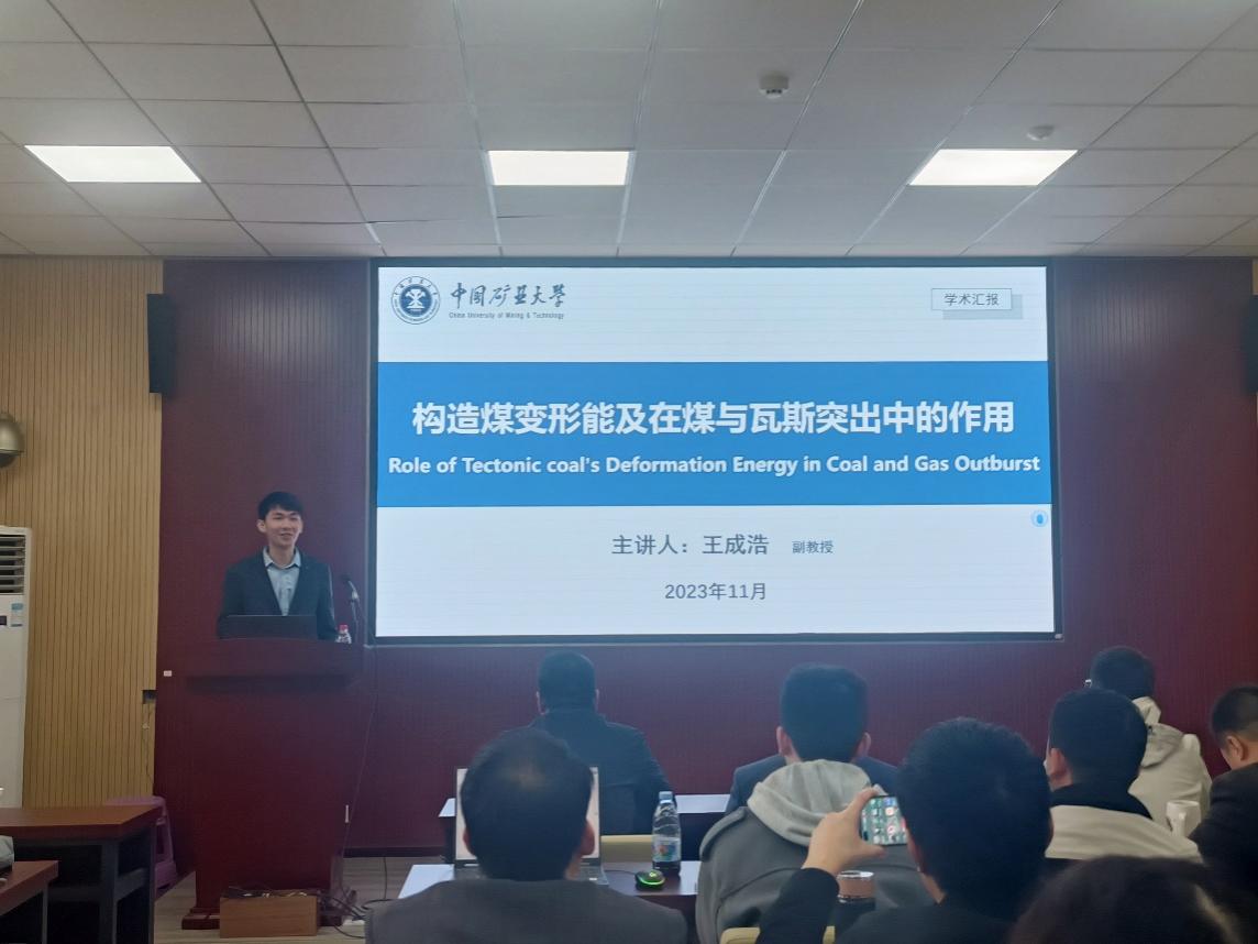 王成浩副教授以“构造煤变形能及其在煤与瓦斯突出中的作用”为题,围绕变形能对煤与瓦斯突出的控制作用,结合实验研究与数值分析,系统阐述了构造煤变形能的释放机制、变形能释放与瓦斯膨胀能释放的内在关系、突出孕育-激发阶段的变形能释放原理。