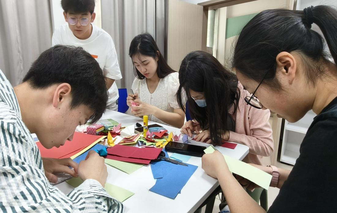 谢亚秋老师首先带领同学们进行放松训练。伴随着舒缓的音乐,大家通过系列手部放松动作逐步卸下压力,调整状态,为后续活动做好心理准备。随后,同学们分组开展折纸创作,围绕造型设计、色彩搭配等展开头脑风暴,在协作中激发创意、增进交流。