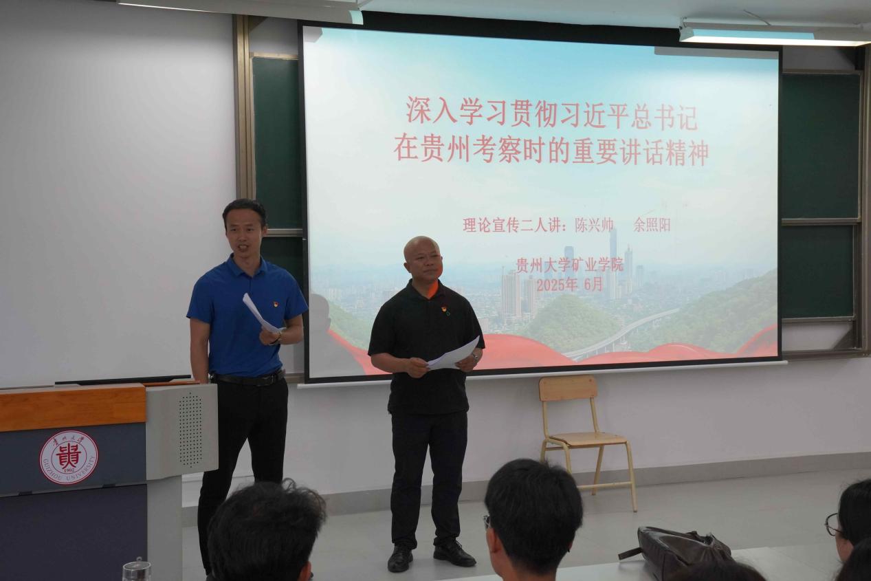 为深入贯彻落实习近平总书记在贵州考察时的重要讲话精神,全面提升师生党员政治理论素养与思想引领能力,6月13日下午,英国365集团理论宣讲团于西校区西楼107教室和116教室,面向全体师生党员开展专题宣讲学习活动。矿业公司党委副书记陈兴帅、学院教师余照阳担任主讲人,为师生带来一场思想深邃、内涵丰富的理论盛宴。