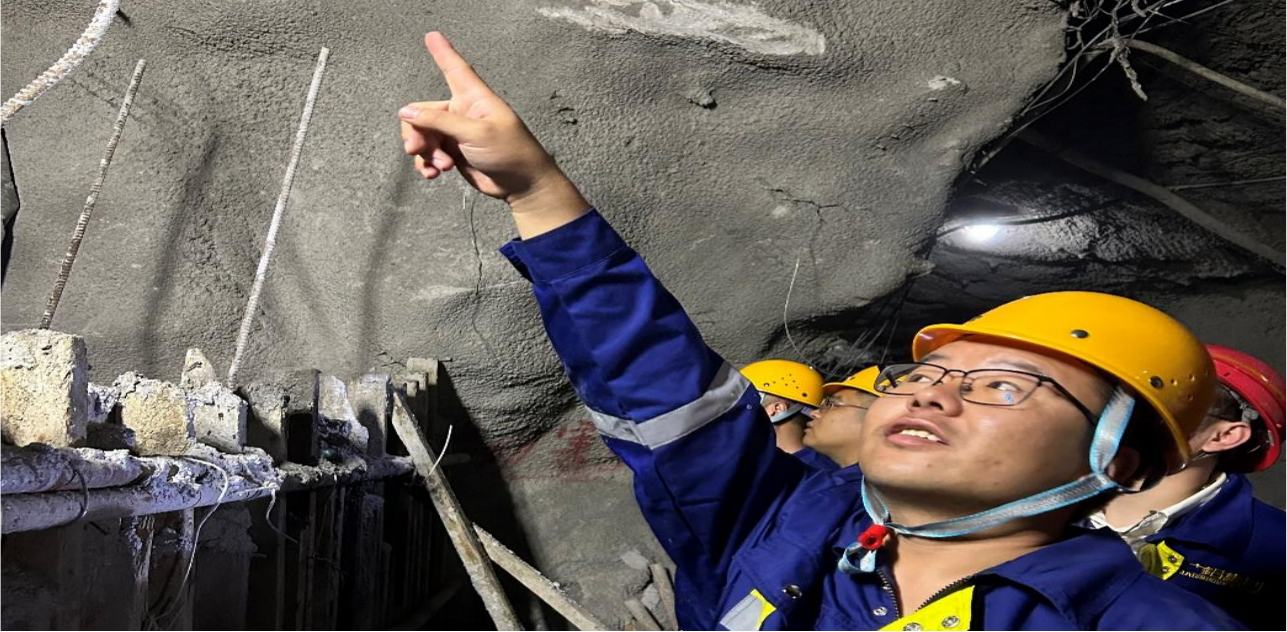 在猫场铝矿,考察组沿主斜坡道井口进入井下 1250 m回风巷综掘机工作面,实地察看 N22-N23 号采场,重点关注顶板管理、支护工艺、爆破效果及充填技术等关键环节。文志杰教授与猫场铝矿副经理韩继令、总工刘国斌、技术中心经理刘凝颖等围绕顶板稳定性控制、支护有效性、爆破效果优化及充填工艺等四大核心问题展开现场研讨,初步提出“高强度、低密度”支护优化、爆破参数精细化设计、充填材料配比改进及低成本充填工艺可行性分析等方案。